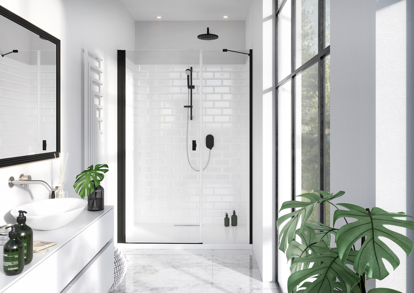 na rośliny doniczkowe. Jeśli lubimy styl industrialny, możemy wybrać kabinę z nadrukiem czarnych szprosów. Do nich dopasujmy geometrią i kolorem stojaki na rośliny. Komfortowe modele o różnej wielkości i sposobie montażu podpowiada marka Radaway. Polski producent ma w ofercie również kabiny zamawiane na wymiar. Takie najlepiej sprawdzą się
