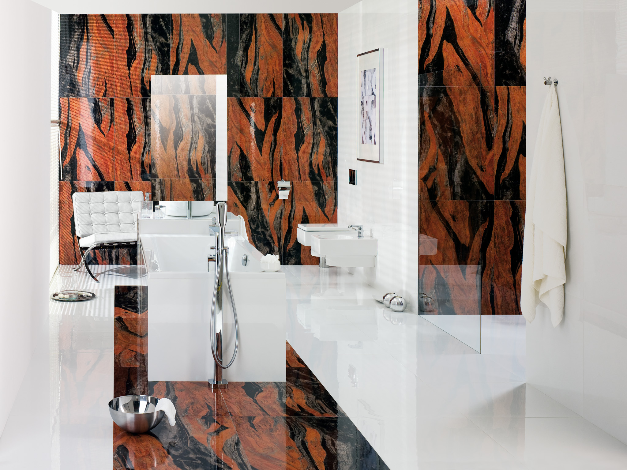 Ogień to siła, moc i energia. Tym, którzy podczas porannej toalety „ładują energetyczne akumulatory” z pewnością spodobają się płytki Inferno. Przeplatające się ze sobą czernie i czerwienie dają niesamowity efekt przypominający lawę spływającą po zboczach wybuchającego wulkanu. Patrzącym z innej perspektywy płytki mogą kojarzyć się z tańczącymi płomieniami ognia. Duży format 90×60 uspokaja kompozycję i równoważy dynamizm rysunku.