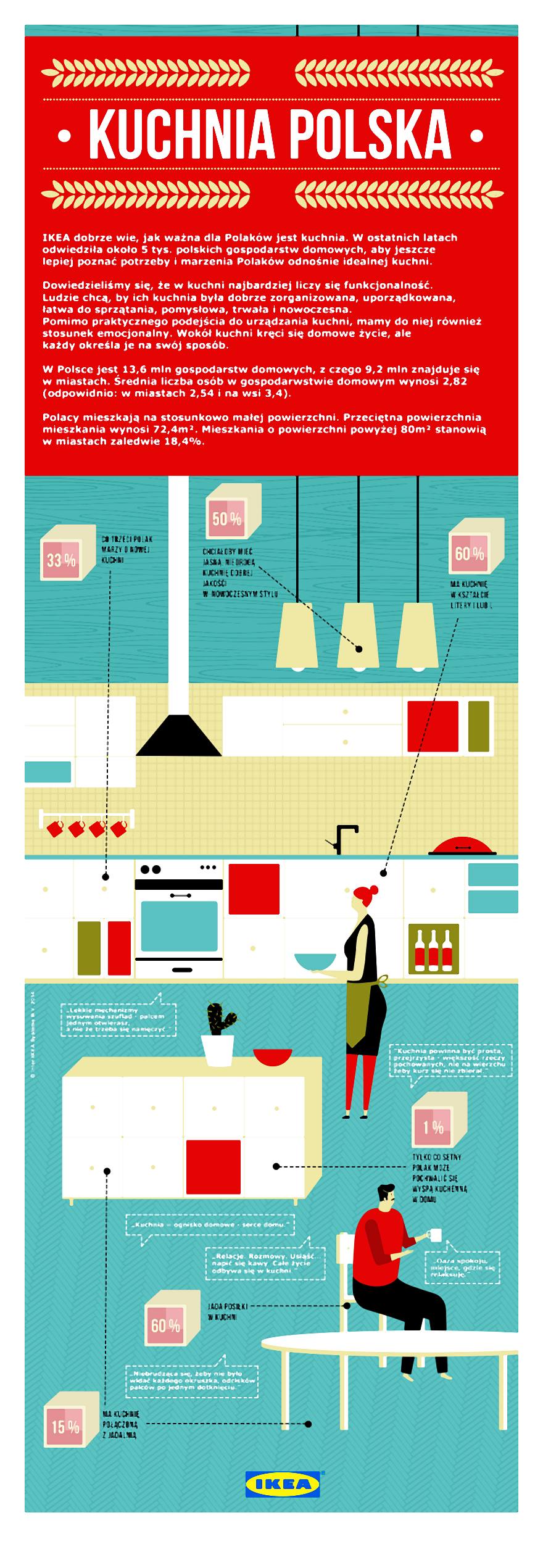 Wielu z nas mieszka na małych powierzchniach. Z badań przeprowadzonych na zlecenie IKEA wynika, że około 70% Polaków ma kuchnię o wymiarach 6-15 m2, a około 20% nawet mniejszą niż 6 m2. Tylko w co dziesiątym domu jej metraż przekracza 15 m2. Ze względu na ograniczoną powierzchnię tylko co setny Polak ma kuchnię z wyspą, choć wielu o takiej marzy. W niewielu domach jest ona także połączona z jadalnią (tylko u 15% badanych). Polskie kuchnie są w większości zaaranżowane w kształcie litery ?I? lub ?L? (ponad 60%).
