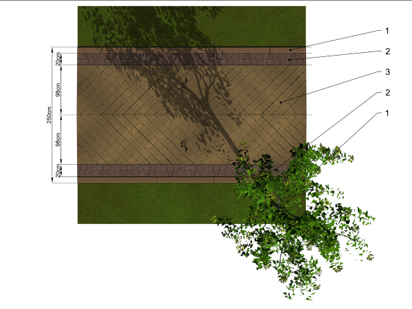 To byłoby w zasadzie wszystko, gdybyśmy rozmawiali o chodnikach, tarasach lub innych nawierzchniach przeznaczonych wyłącznie do ruchu pieszego. W wypadku podjazdów rzecz ma się jednak nieco inaczej. Do gry wchodzi tu jeszcze parametr obciążenia. Wiąże się on głównie z grubością kostki, ale także podbudowy, a więc również z głębokością korytowania. Do brukowania ciągów pieszych wystarcza kostka o grubości 4cm. To jednak zdecydowanie za mało nawet w przypadku podjazdu dla samochodu osobowego. Ten potrzebuje kostki o minimalnej grubości 6cm. Jeżeli natomiast planujemy możliwość poruszania się jeszcze cięższych pojazdów (na przykład śmieciarki czy wozu do obsługi szamba), powinniśmy zastosować bruk o grubości przynajmniej 8cm. Oznacza to że grubość korytowania z minimalnych 15 – 20cm w wypadku chodników może urosnąć nawet do 50cm. Znaczenie ma również kierunek układania kostki. Na podjazdach i wjazdach na posesję – szczególnie tych o dużym nachyleniu, kostka powinna być układana pod skosem do kierunku jazdy oraz do kierunku spadku, najlepiej jeśli jest to kąt 45°. W wypadku odcinków płaskich w grę wchodzi oczywiście tylko kąt do kierunku jazdy. Zwiększa to nośność i stabilność nawierzchni, a także zmniejszy hałas wywoływany przez przejeżdżający pojazd. Dodatkowo ułatwi odprowadzenie wody z nawierzchni. Tu jednak najważniejszy jest odpowiednio wyprofilowany spadek poprzeczny. Musi on umożliwić odprowadzenie wody na nawierzchnię nieutwardzoną. W zależności od tego, jak równa jest płaszczyzna podjazdu, powinien wynosić od 2 do 4%, co oznacza że na metrze szerokości podjazdu różnica poziomu powinna wynosić od 2 do 4cm. Może być jednostronny (co jest łatwiejsze wykonawczo, ale powoduje powstanie dużej różnicy poziomów) lub dwustronny, zdecydowanie bardziej estetyczny ale nieco bardziej skomplikowany do uzyskania. Niezależnie od tego, jaki spadek zostanie zastosowany – całość nawierzchni powinna być nieco uniesiona w stosunku do otaczającego ją gruntu nieutwardzonego. Zapobiegnie to nanoszeniu na podjazd błota w czasie gwałtownych ulew.